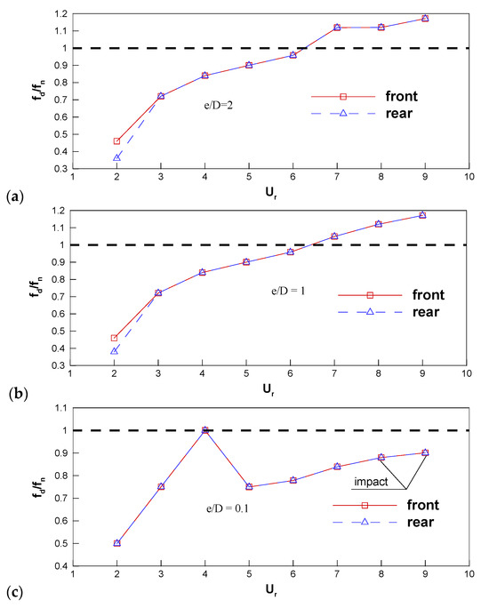 (1) For the one-isolated-cylinder case, collision with the wall occurs at a larger reduced velocity and a higher time-averaged lift coefficient is acquired for a small . For each of the three , the predominant frequency of cylinder vibration coincides with that of the hydrodynamic force at the most and deviation occurs at large . The minimal and maximal gaps, and , increase with increasing and a larger always accompanies a smaller in the lock-in region. The positive vortices shed from the gap-side surface are suppressed and their intensity gradually becomes stronger as increases;