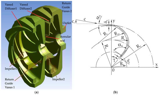 Multistage centrifugal pumps are widely used in many industries, including energy, domestic water supply and agriculture, as part of fluid transport systems where high pressure (head) is required. It is well known that turbomachinery is one of the main consumers of electricity worldwide. According to Ref. [], the world market volume for centrifugal pumps is in the order of USD 20 billion per year. The increasing demand for energy efficiency necessitates improvements in the components of these machines, which are significant energy consumers worldwide. In-depth research on this problem in Bulgaria has been performed at the University of Ruse. In Ref. [], the author proposes a large-scale experimental and theoretical study concerning the return device of a multistage centrifugal pump 11MT32, manufactured by VIPOM, Vidin, Bulgaria. The studies are related to the determination of the impact of the geometry of the return guide vanes (RGVs) on the indicators of the studied stage as well as of the entire pump. The number of RGVs is equal to the number of Radial diffuser vanes downstream of the pump impeller. The vanes are profiled on arcs of circles.