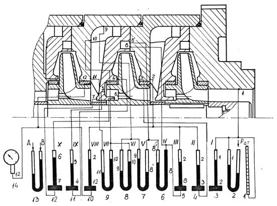 Figure 4 represents a schematic of the experimental pump. The diagram is taken from Ref. [] and is published with the permission of the author, P. R. Petrov. The focus of this study is the intermediate pump stage, which consists of an impeller, vaned diffuser, and return guide vanes. The primary goal of the first pump stage is to create the necessary conditions before entering the second stage. During the experiments, the impeller of the third stage is removed. The diagram indicates the points where water pressure is measured using corresponding manometers (pressure gauges), which are marked and numbered. The head H of the step is determined by readings from devices connected at points 2 (before the entrance of the tested stage) and 12 (after the exit of the tested stage). Additional experiments are conducted to determine leakages through annular seals, and the results are published in Ref. [].