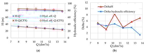 The validation of numerical results includes (a) relationships regarding the impact of flow rate on head and hydraulic efficiency, obtained through experimental methods (as seen in Ref. []) and numerical simulations; (b) relative errors  and  given as functions of the flow rate.