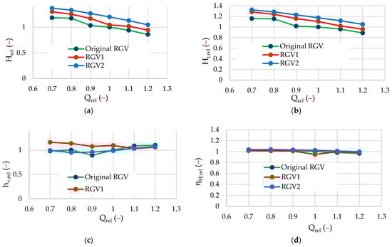 In order to illustrate the impact of RGV on the losses in the pump stage, the relationships between the relative losses, described by Equation (15), and the relative flow rate when operating with the three types of RGV are presented in Figure 8.