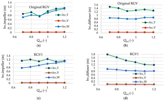 The analysis of the graphs clearly indicates that in all cases, the losses ,  and  have similar values when the pump is operating with the original RGV and RGV2, which holds true for the entire range of flow rate studied. The loss values when operating with RGV1 fluctuate between those of RGV2 and the original RGV. Losses  obtained in the pump impeller predominate when operating with RGV1, while losses  in the diffuser predominate when operating with RGV. When using the diffuser, the individual types of losses are similar when operating with the three studied vanes. Analyzing the previous statements leads to the conclusion that the shape (design) of the studied vanes does not have a significant impact on the losses in the pump stage, as well as on its hydraulic coefficient of efficiency.