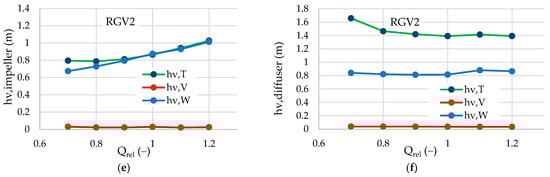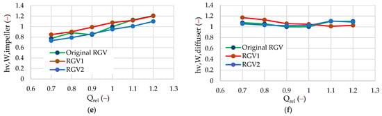 Relative losses in the Impeller and Radial diffuser 1 obtained as a result of entropy production. This includes (a) the relationships concerning the losses , presented as head losses obtained in Impeller 2 when operating with the three types of RGV; (b) the relationships concerning the losses , presented as head losses obtained in Radial diffuser 1 when operating with the three types of RGV; (c) the relationships concerning the losses , presented as head losses obtained in Impeller 2 when operating with the three types of RGV; (d) the relationships concerning the losses , presented as head losses obtained in Radial diffuser 1 when operating with the three types of RGV; (e) the relationships concerning the losses , presented as head losses obtained in Impeller 2 when operating with the three types of RGV; (f) the relationships concerning the losses , presented as head losses obtained in Radial diffuser 1 when operating with the three types of RGV.