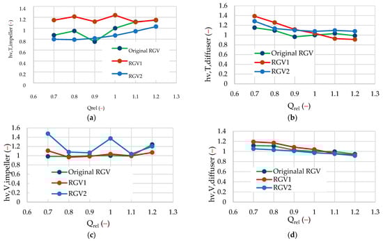 The analysis of the relationships, presented graphically in Figure 10, clearly indicates that in all pump modes, when operating with the original RGV, . In the case of using RGV1 and RGV2  in all cases studied, as, in addition , it is observed that operating with RGV2 has a lower value (larger absolute value) than , operating with RGV1. Based on the previous statement, in the authors’ opinion, the impact of the RGV angle  on the velocity distribution in front of the inlet of the next impeller can be seen, and thus also on the theoretical head of the studied impeller. When RGV has the largest angle (128 deg),  has the lowest value, which, according to Equation (17), leads to an increase in head . Since the shape (design) of the vane does not result in a significant increase in losses, this leads to obtaining a greater head  of the pump stage.