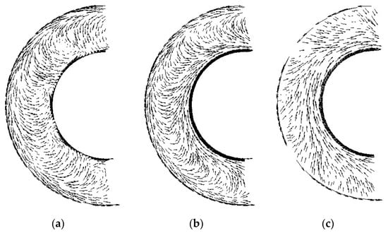 A velocity field of the absolute velocity  concerning a cross-section located just at the inlet of Impeller 2 being analyzed under the following conditions (a) when operating with the original RGV and flow rate Q = 11.39 dm3/s; (b) when operating with RGV1 and flow rate Q = 11.39 dm3/s; (c) when operating with RGV2 and flow rate Q = 11.39 dm3/s.