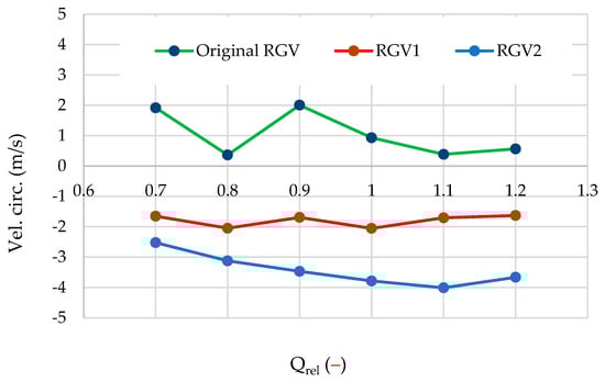 In the presented figure, it can be observed that when operating with RGV2 (b), the vector field is mainly oriented in a direction opposite to the rotation of the impeller. This affects the value of circumferential velocity . To assess this impact, the value of  is to be calculated—the mass flow averaged circumferential velocity in the studied cross-section. Figure 10 presents a relationship of the type , which is obtained based on the results of CFD modeling.