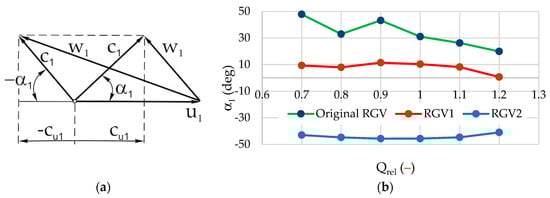 Impact of RGV on (a) velocity triangle in front of Impeller 2 inlet; (b) angle  in the studied range of flow rates.