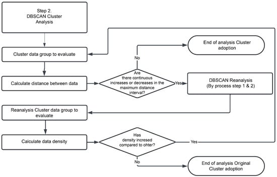 - If the data interval is graphed, it can be represented as shown in Figure 10. If the data interval was larger than the overall average and the interval continuously increased or decreased, a DBSCAN cluster analysis was performed. If the data interval continues to increase, the main route is divided into several routes, and if the data gap continues to decrease, several routes are merged into the main route.