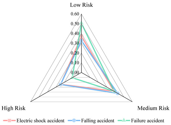 The evaluation result is a 1 × 3 matrix, where the elements from left to right represent the membership degrees of low risk, medium risk, and high risk. According to the maximum membership principle of the fuzzy comprehensive evaluation method, the evaluation level with a higher membership degree is selected as the final risk level.
