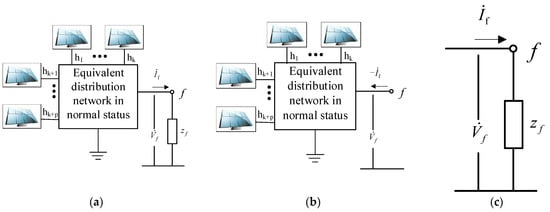 Keeping the boundary conditions at the fault position unchanged, the original part of the network is separated from the faulty branch, as shown in Figure 1b. For a network in normal status, the occurrence of a symmetrical short-circuit fault is equivalent to the addition of an injected current, , at the faulted node f, where the short-circuit current is positive in terms of outflow from the faulted point, and the nodal current is positive in terms of injection. Therefore, the voltage at any node i in the network can be expressed as