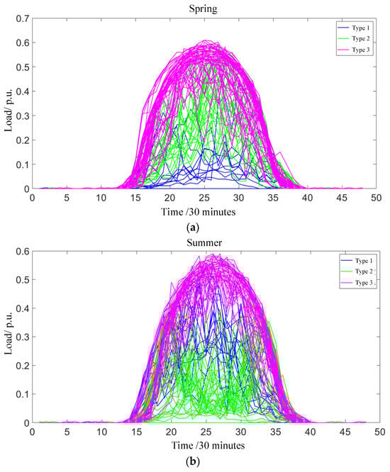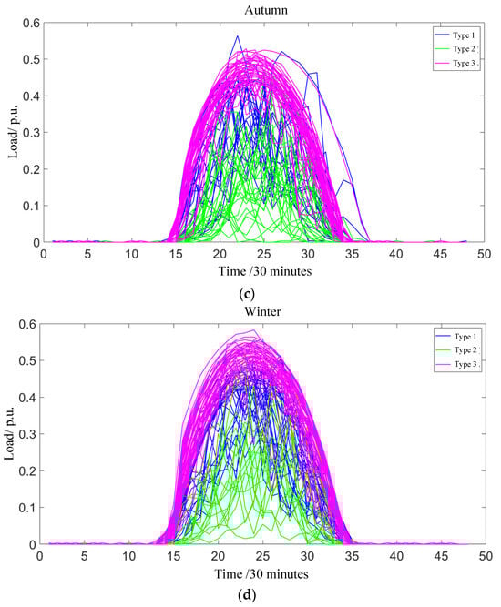 Cluster analysis of PV output power: (a) spring season; (b) summer season; (c) autumn season; (d) winter season.