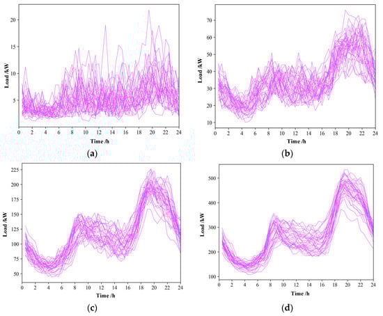 Different from the total load connected to the high voltage busbar, the decentralized load in the distribution network is usually less than 100 kW, and it has high fluctuation. Since the distributed PV stations exists in a rural area, the corresponding electricity load mainly belongs to residential load. The data from the SGSC project in Australia are selected in this paper [31]. There are thousands of residential load data recorded from 2012 to 2014. Firstly, three hundred households are randomly selected from all records, and then ten households, fifty households, and one hundred and fifty households are randomly selected from the three hundred households separately. As shown in Figure 3, the summary residential load of ten households, fifty households, one hundred and fifty households, and three hundred households in one winter day are analyzed and clustered for output power fluctuation analysis.