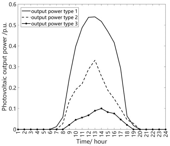 For the DGs in the selected 69-node distribution network, three typical daily output power curves are calculated based on the cluster results in Figure 2, which are shown in Figure 6. Type 1, type 2, and type 3 of daily output power curves are related to a sunny day, cloudy day, and rainy day, respectively.