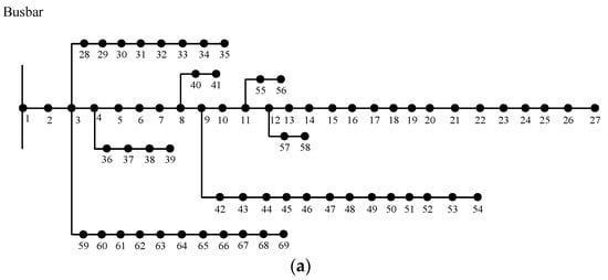 As shown in Figure 7a, in the first case, there are no DGs in the 69-node distribution network. In the second case shown in Figure 7b, six DGs are connected into the distribution network, and the total rated capacity of these DGs are 50% of the total maximum load power. Different from the second case, there are six DGs connected into different nodes in the third case, which is shown in Figure 7c, and the total rated capacity of these DGs are 70% of the total maximum load power.