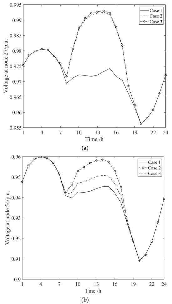 Voltage at some selected nodes on sunny days during 24 h: (a) node 27; (b) node 54.