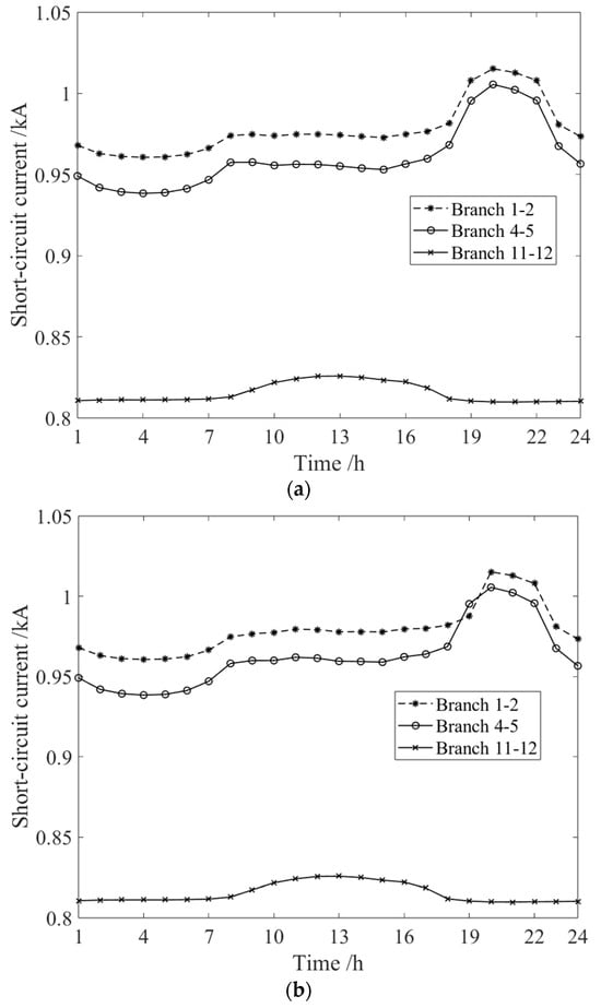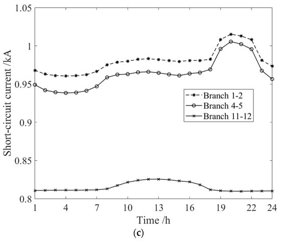 Because the fluctuation in electrical load would affect the node voltage, the fault current in branches would change over time. In the first case, when the fluctuation in the load is taken into account during the calculation of the short-circuit current, the short-circuit current in the branches would change over time. As shown in Figure 10, the short-circuit currents in branches 1–2, 4–5, and 11–12 vary with time. For the short-circuit current in branch 1–2, the minimum value is 0.8946 kA at 4:00, and the maximum value is 0.9155 kA at 20:00. A similar analysis can also be used for branch 4–5; the results show that the short-circuit current may vary from 0.8792 kA to 0.9161 kA. In other words, the maximum short-circuit current is 1.042 times the minimum value for branch 4–5 because of the fluctuation in loads.