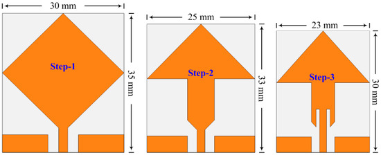 Step 1: Initially, a rhombus-shaped antenna with an overall geometrical size of 30 mm × 30 mm is designed by rotating the square-shaped patch at 45°. The antenna is fed by a coplanar waveguide feedline. The antenna dimensions at this stage are obtained by using standard mathematical formulas [47]. The antenna designed in this step offers dual resonances at 2.45 GHz and 11 GHz, as depicted in Figure 3a. The obtained results exhibit that the impedance matching is not good at the targeted frequency band of 2.45 GHz.