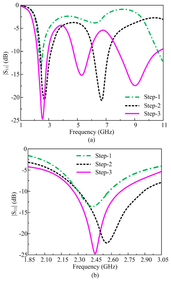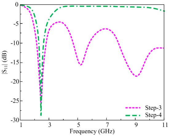 The antenna design obtained in the previous section is further optimized to obtain the filtering characteristics. Following the antenna obtained previously with miniaturized dimensions of 23 mm × 30 mm, an additional rectangular-shaped stub is loaded between feedline and antenna. This additional stub filters out the upper band resonances at 5.2 GHz and 9 GHz and results in an antenna operating over the 2.45 GHz band. The resultant antenna offers harmonic suppression from 3 GHz to 11 GHz in order to reduce interference and an operational band at 2.45 GHz. The design steps are depicted in Figure 4, and the corresponding S-parameter results are demonstrated in Figure 5.