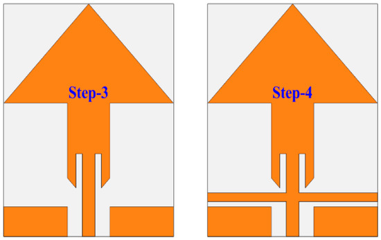 Step 2: In the second step, the design is modified into an arrow-shaped antenna by truncating the lower half of the patch. Also, the antenna design is miniaturized at this step to obtain the overall dimensions of 25 mm × 33 mm. This modification results in the improvement of bandwidth and impedance matching. However, minor shifting is observed from 2.45 GHz to 2.6 GHz for the lower band, whereas the upper band is also shifted from 11 GHz to 6.8 GHz, as shown in Figure 3.