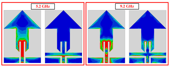 To further elaborate the operational behavior of proposed filtenna, the surface current distribution is provided at two filtered resonances of 5.2 GHz and 9 GHz, as illustrated in Figure 7. It can be seen that at 5.2 GHz, where there is no rectangular stub, the maximum current is on feedline and slots at the tail of an arrow-shaped patch. However, after the inclusion of the stub, the current at the upper part of the antenna is minimum, with the maximum amount of current at the edges of the rectangular-shaped stub, which is used to filter the resonance. Similarly for 9 GHz, the maximum amount of current is observed at the lower end of the antenna and feedline without a stub. On the other hand, when the rectangular stub is loaded, the maximum amount of current is noted at the edges of the loaded stub and feedline.