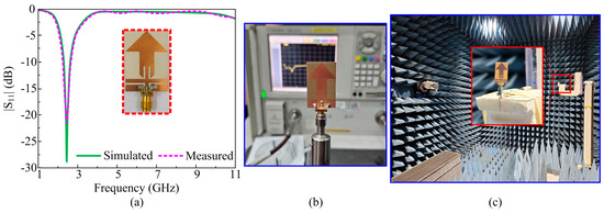 Figure 9a exhibits the comparison of simulated and measured |S11| results of proposed filtenna. It is noticed that the proposed arrow-shaped filtenna obtained am ISM band at 2.45 GHz ranging from 2.276 to 2.75 GHz, demonstrating the strong correlation between simulated and measured results. The results obtained by the proposed design ascertain their suitability as a potential candidate for future portable electronic devices operating at the ISM band. Figure 9b contains the antenna prototype under test for S-parameter measurements using a PNA series network analyzer having model number E8362B by Agilent Technologies (Santa Clara, CA, USA). Moreover, Figure 9c contains the antenna for far-field measurements inside the anechoic chamber.