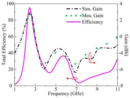 Figure 11 represents the gain and radiation efficiency of the proposed flexible filtenna. It can be seen from the displayed figure that the antenna offers gain >2.6 dBi throughout the operational bandwidth of 2.2–2.8 GHz with a peak value of 2.9 dBi at a resonance frequency of 2.45 GHz. It is also observed that at filtering spectrum 3–11 GHz, the antenna gain is below −3 dBi. The measured value provides strong support in favor of simulated results. Furthermore, the radiation efficiency plot in Figure 10 demonstrates a value >90% over the entire operational spectrum, whereas for filtered bands the value of efficiency is less than 40%. The farfield performance of the proposed flexible filtenna endorses it as a suitable contender for imminent electronic devices operating over the ISM band.