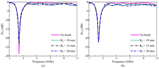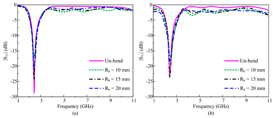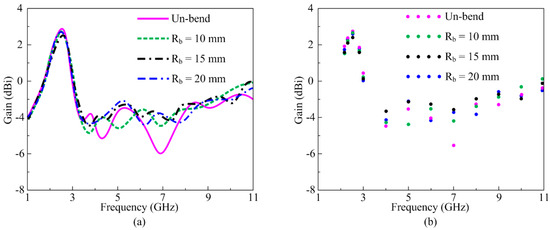 Figure 14a,b shows the simulated and measured S-parameter plots of the proposed flexible filtenna in unbent and bent conditions with radii of 10 mm, 15 mm, and 20 mm. It is noted that when filtenna is bent along the x-axis at various radii, the rectangular stub and upper part of the patch are folded, which results in slight distortion in antenna performance as compared to the unbent condition, also evident from the S11 plots in Figure 14. However, the overall filtering performance of filtenna remains stable with desired resonance in the ISM band and highly suppressed for the upper frequency bands. Similarly, Figure 15a,b exhibit the simulated and measured gain of the antenna for unbent as well as bent configurations along the x-axis. It is noticed that the antenna, when bent at various radii, offers gain > 2.5 dB through an operational bandwidth of 2.2–2.8 GHz, whereas for the filtering band ranging from 3 to 11 GHz, the gain value of <−4 dB is obtained. Hence, it is verified that the filtenna performance remains stable regardless of being folded. The measured value of gain also provides good agreement with simulated results.
