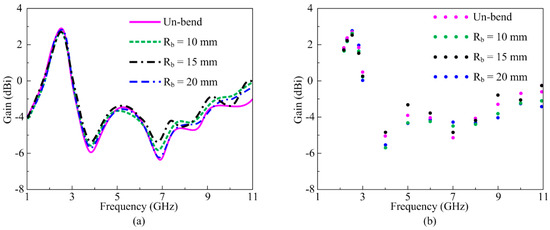 In the same way, the bending analysis of proposed filtenna at radii of 10, 12, and 15 mm along the y-axis is demonstrated in Figure 16a,b. As the rectangular stub plays a major role in filtering the upper frequency bands, a minor distortion is observed for the S-parameter, resulting in a bent state due to the bending of the rectangular stub and the side edges of the arrow-shaped patch. However, this distortion is insignificant, and the overall performance of the filtenna remains unaffected. In addition to S-parameter results, simulated and measured gain for the proposed filtenna in bent condition along the y-axis at 10 and 12 mm radii is exhibited in Figure 17a,b. It is found that proposed filtenna offers gain >2.5 dBi throughout the operational band of 2.2–2.8 GHz, whereas for the filtered band ranging from 3 to 11 GHz, the gain remains negative. Simulated and measured results are in strong agreement, ascertaining the pertinence of proposed filtenna for current and impending flexible electronic devices.