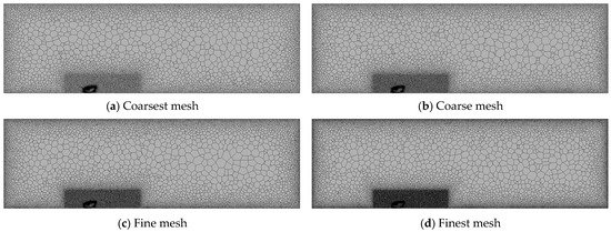 To accurately resolve this region, the non-dimensional wall distance , which includes the log layer, was set to 75 [27]. This setting ensures an appropriate resolution within the viscous sublayer, where the effects of viscosity are particularly pronounced. Based on this mesh configuration, four different mesh systems were created to conduct a grid convergence study. Figure 3 presents the results of four different mesh configurations with varying base sizes, all maintaining the same mesh topology, shown on a longitudinal plane.