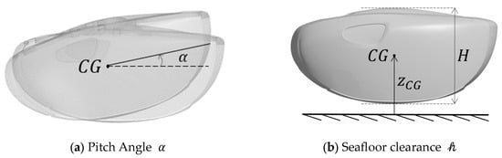 In this section, the process of identifying the optimal posture that induces the maximum downforce is described. The posture is defined by two parameters: the pitch angle and the seafloor clearance . The variation range of each parameter was selected considering the degree of change in the downforce. The CFD simulations were conducted accordingly, and a comparison was made between the optimal case, where downforce is maximized, and the suboptimal case, where downforce is minimized.
