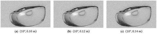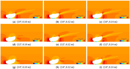 The angle of attack varies from 10° to 14° at intervals of 2°, resulting in three levels. Similarly, the distance from the seabed has three levels: 100 mm; 120 mm; and 400 mm. The corresponding values of parameters are presented in Table 2.