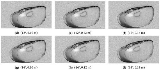 Based on the two parameters, and , which define the range, a computational mesh necessary for the CFD simulation was generated. Figure 7 shows the mesh and the corresponding number of meshes for all nine cases, considering the variations in both angle and distance. The central cross-section and surface mesh used the same configuration values regardless of the posture.