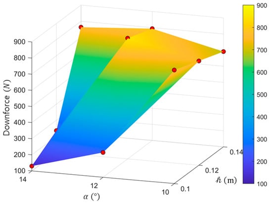 Downforce response surface with respect to the attitude pitch angle and the seafloor clearance . The red markers indicate the original data points used for constructing the response surface.