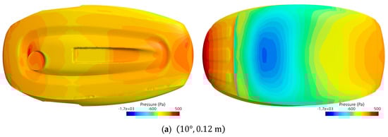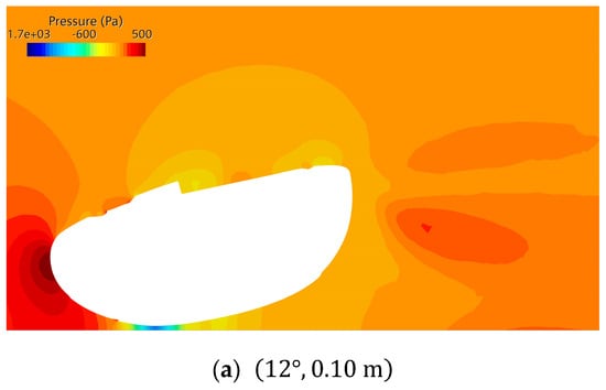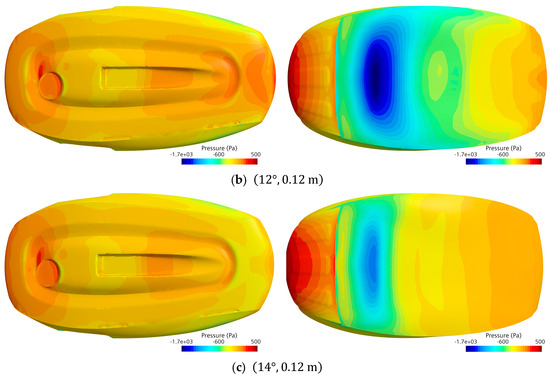 Figure 13 illustrates the pressure distribution on the upper and lower surfaces of the CR200 influenced by the seafloor clearance, which serves as a key factor in generating downforce. At first, the pressure on the lower surface, contributing to the suction force towards the seabed, increases progressively from Figure 13a to Figure 13b. In contrast, in Figure 13c, where the pitch angle is at its maximum, a contrasting phenomenon occurs, with the magnitude of suction decreasing.