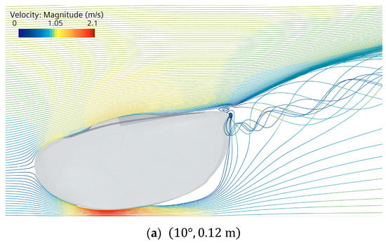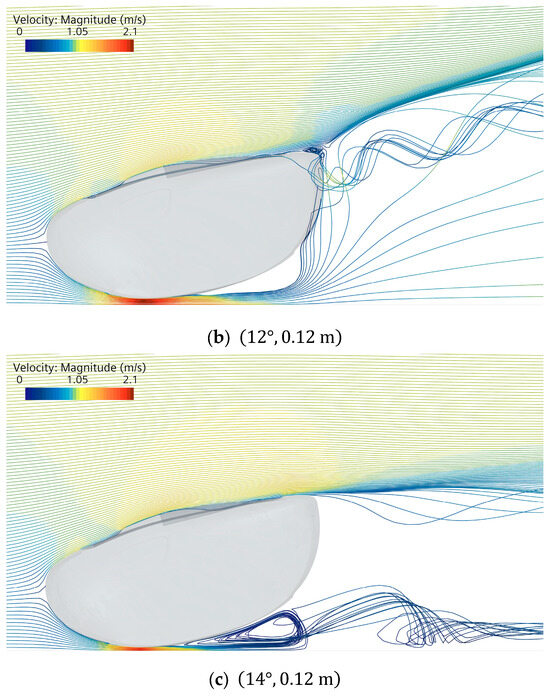 The upward reflection of the streamline by the robot is the most evident proof of downforce generation. Figure 14 illustrates the streamline reflection with increasing head-down pitch angle. Initially, as shown in Figure 14a, the flow reflection increases as the pitch angle increases, reaching its maximum in Figure 14b. However, this pattern does not continue in a consistent manner. As shown in Figure 14c, after surpassing the optimal angle at around , the flow reflection dramatically decreases, indicating the so-called post-stall attitude. The resulting loss of downforce can also be confirmed by the pressure distribution shown in Figure 13c.