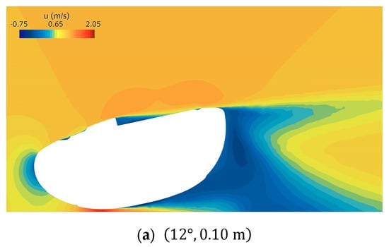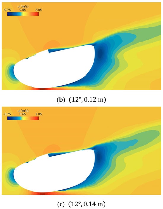 Figure 16 shows the velocity distribution in the x-direction, aligned with the incoming flow. The result demonstrates the clearance effect for the predetermined pitch angle. By only changing the seafloor clearance, the flow acceleration effect is quantitatively presented. Interestingly, the flow acceleration does not vary in a monotonic manner; rather, an optimal clearance exists, as shown in Figure 16b. If the clearance is too small, as represented in Figure 16a, the blockage effect dominates over the Venturi effect. As the clearance increases, the flow generally accelerates. However, this trend does not persist. For even wider clearances, the flow decelerates again, as shown in Figure 16c.