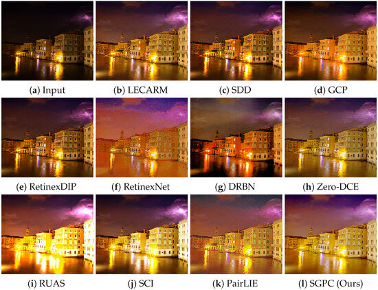 The experimental results on various datasets are compared to the state-of-the-art low-light image enhancement methods to demonstrate the better results of the SGPC, as shown in Figure 3 and Figure 4. According to experimental findings, our method produces visually appealing results in terms of brightness, chromaticity, and naturalness. When there are under- and over-exposure regions in an image, our method can effectively restore dark areas while preserving the visual quality from bright parts. This is ensured by a luminance correction guide that employs low-light images as enhancement models. While RetinexNet [35] successfully recovers texture information in dark areas, it tends to amplify noise, yielding severely degrading local details. By contrast, as illustrated in the sky region of Figure 4, our proposed method, supported by PGF, smooths noise while preserving texture details. Although DRBN [36] performs well under supervised evaluation metrics, their training processes are sensitive to data distribution, resulting in lower generalization capabilities for such models.