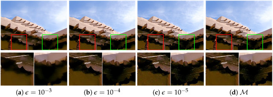 The regularization parameter is applied in the guided filtering algorithm to regulate the extent of filtering. In more detail, a larger causes more blurriness, while a smaller preserves finer information in the image. To demonstrate the importance of the regularization map proposed in this paper, we apply various values and the regularization map to the model for comparison. is the case where the parameter is a matrix. This means that when the parameter is , each pixel has its unique regularization parameter. A visual example is given in Figure 6. The results indicate that the blurriness is significant when , diminishing the clarity of the pillar’s contours. Employing preserves more texture information but is less effective in removing noise from the wall area. Although smoothing is moderate when , a closer inspection of Figure 6b,d reveals that a pixel-wise regularization map not only eliminates noise but also upholds more texture features in the dark areas. In general, using a regularized parameter matrix can enhance the effect more accurately than using a single parameter value.