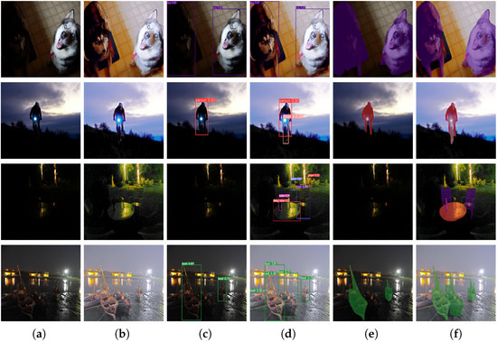 Application examples of low-light image detection and segmentation. (a) Low-light input image, (b) Image enhanced by SGPC, Parts (c,d) depict the object detection results of (a,b) respectively. Parts (e,f) show the instance segmentation results of (a,b) respectively.