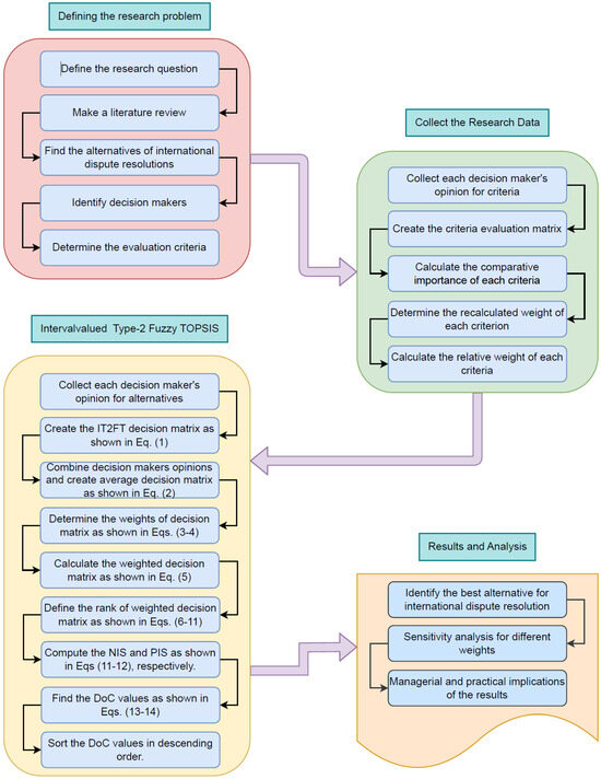 This research is structured as follows: the relevant literature review, in terms of international dispute resolution methods and interval-valued fuzzy logic, are presented in Section 2. Section 3 provides the proposed IVT2F-TOPSIS methodology, and the application of IVT2F-TOPSIS in international dispute resolution evaluation is presented in Section 4. The managerial and practical implications of the proposed approach and the validation of IVT2F-TOPSIS are shown in Section 5. Finally, this research is completed by presenting the conclusions and future work directions in Section 6.