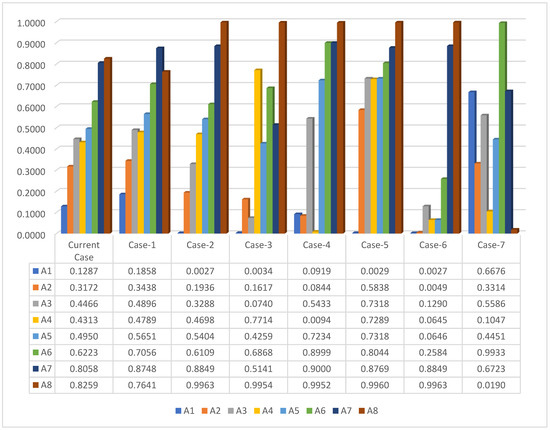 Sensitivity analysis is performed to better understand the impact of each criterion on the decision. This analysis shows which criteria are more dominant and which criteria are more affected by changes in their weights. Thus, decision-makers can better understand which criteria are the most critical. Furthermore, sensitivity analysis increases the transparency of the model. It shows under what conditions and to what extent the results change, facilitating understanding of the decision process and supports the scientific validity of the results. Therefore, sensitivity analysis provides decision-makers with a flexible perspective. Understanding how to make decisions under different scenarios makes it possible to make more adaptive and robust decisions under alternative conditions. For this purpose, the closeness indexes for each case scenario are computed using Equations (1)–(16). The case scenarios are presented in Table 11. Figure 2 shows the computed criteria weights for several scenarios. This allows decision-makers to see how changes in criteria weights impact the overall decision outcome, leading to more informed and confident decisions. By presenting the results, decision-makers can easily compare and evaluate different scenarios to make the best possible choice.
