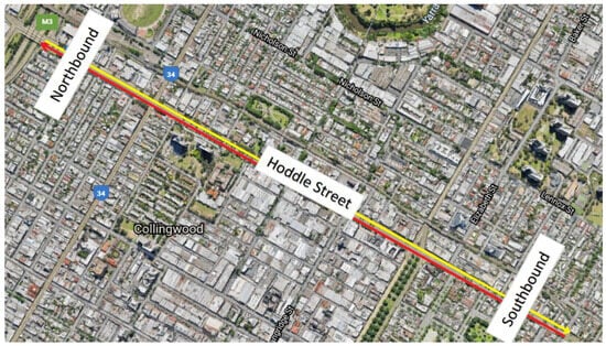 The Hoddle Street section used for collecting datasets [63]. Note: The red arrow represents the Northbound direction towards the Eastern Freeway and the yellow arrow represents the Southbound direction towards Citylink.