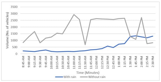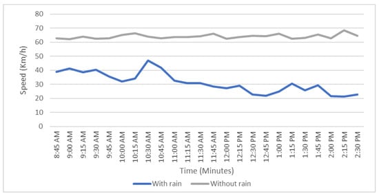 The weather data were aggregated into 15-min intervals to match the speed and flow input field observations. Figure 3 and Figure 4 show speed and flow data under rainfall conditions. The data were incorporated alongside traffic flow and speed to evaluate the model’s effectiveness under weather conditions. The x-axis shows the time between the observations, while the y-axis shows the speed/volume conditions for the selected arterial road. The blue line represents the speed/volume values during rainy days, while the grey line refers to the speed/volume values during sunny weather.