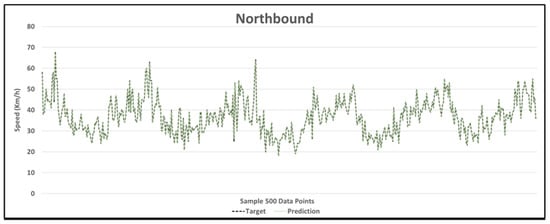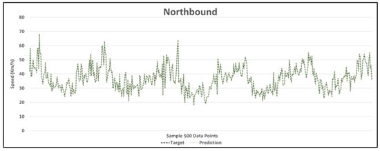 Speed prediction results for 45-min horizons using the 4-BiLSTM model. Source: authors. Note: The first 500 conservative data points in the northbound direction were selected for presentation.