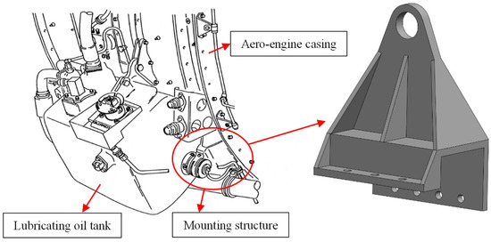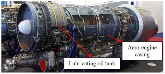 Lubrication systems in aero-engines are used to lubricate and cool bearings, gears, and splines to ensure a high level of safety and reliability for the aircraft even after long periods of operation [1]. One of the important components for storing the lubricating oil is the lubricating oil tank, which is fixed to the aero-engine casing by mounting structures. As shown in Figure 1, the installation arrangement of the lubricating oil tank on an AL-31FN aero-engine. Strong external vibrations of the aero-engine can cause vibration damage or faults in the lubricating oil tank and its mounting structure during services. Therefore, the reasonable vibration reduction of the lubricating oil tank is urgent. Traditional vibration reduction methods, such as adding damping devices, are often difficult to meet the requirements of equipment miniaturisation and lightweight [2]. On the contrary, the damping materials can be used to manufacture aero-engine components to reduce vibration at the source [3].