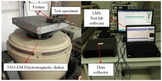 In addition, the PCB 086C01 modal force hammer was used for modal testing, high power amplifier 9363-EM type electromagnetic shaker was used for sweep frequency excitation, a BK-4517 acceleration sensor was used for data acquisition, and LMS Test. lab vibration analysis software (The version number of the software is: Simcenter Testlab 2021.1) was used for data analysis. The shaker and the test system are shown in Figure 3.