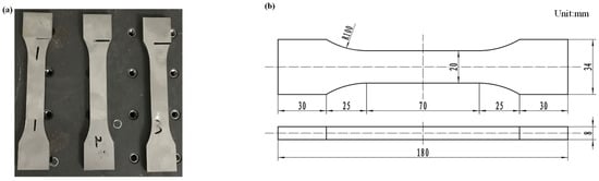 The specimens for this test are depicted in Figure 4a. The specimens are categorised into two groups, one group consisting of Fe-12Cr-3Al alloy material and the other consisting of Q235 carbon steel material, with each group comprising three specimens. The specimens are identical in appearance, and the specific geometric dimensions of the specimens are illustrated in Figure 4b, with the units being millimetres.