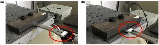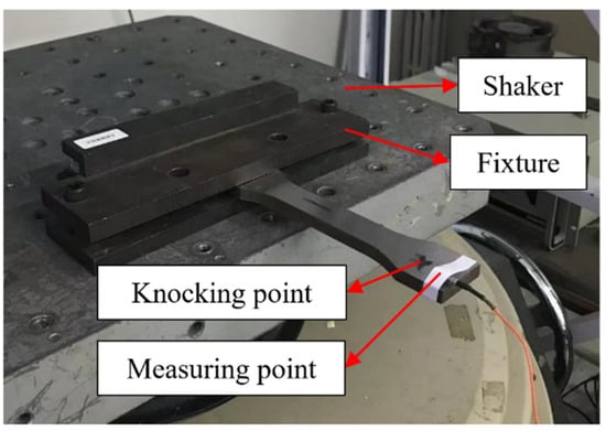 Two measurement points were set up in the shaker sweep excitation test, including cantilever beam outer measurement point 1 and cantilever beam root measurement point 2, and the arrangement of the test points is shown in Figure 7. In addition, cantilever beam outer measurement point 1 is located on one side of the free end of the specimen, with a distance of 5 mm from both end faces, while cantilever beam root measurement point 2 is situated on the central axis of the specimen, at a distance of 10 mm from the clamping end face.