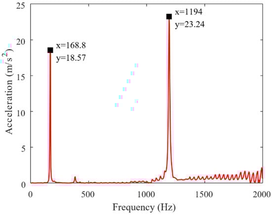 The swept test frequency range of the mounting structure is 0–1500 Hz with an excitation amplitude of 1 g. Extracting the mass block measurement point sweep response data. Comparing the carbon steel material and the high damping alloy material mounting structures sweep response data, the mass block measurement point results are shown in Figure 19 and Figure 20. The comparison results of the vibration response are shown in Table 6.