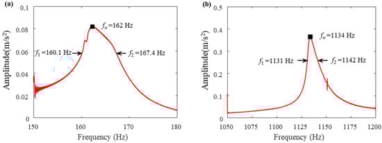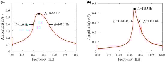 The vibration response was obtained by the shaker sweep excitation method, and the half-power bandwidth method was used to identify the damping parameter. The frequency response test results of the Fe-12Cr-3Al damping alloy specimen 1 at measurement points 1 and 2 are shown in Figure 8 and Figure 9, respectively, where fn is the resonance frequency of the corresponding order of the system and f1 and f2 are the frequencies of the half-power points, respectively. Comparing the resonance frequencies derived from the modal test and the swept frequency test, as shown in Table 1, the relative error is about 5%, indicating the test results have good accuracy. The damping ratios corresponding to the two orders of the resonance frequency are obtained and averaged according to Equation (2).